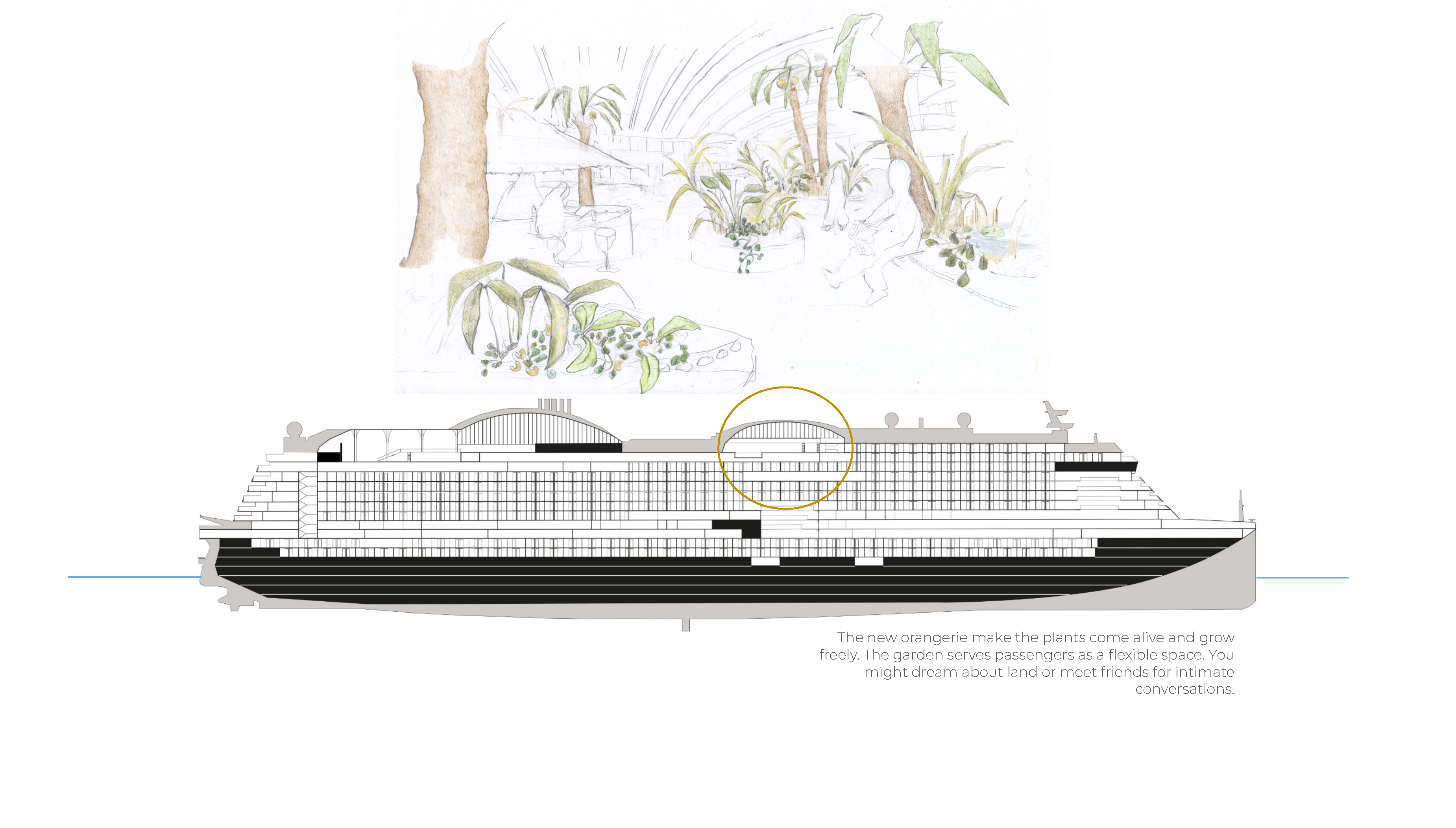 Aidaprima follows a slow route at 0.1 knots around the Barents Sea over the course of 365 days– moving using minimal energy, and encouraging a deeper engagement with the environment and with oneself. It also means a reduction in underwater noise and a reduced risk of ships colliding with whales (known as ship strikes).