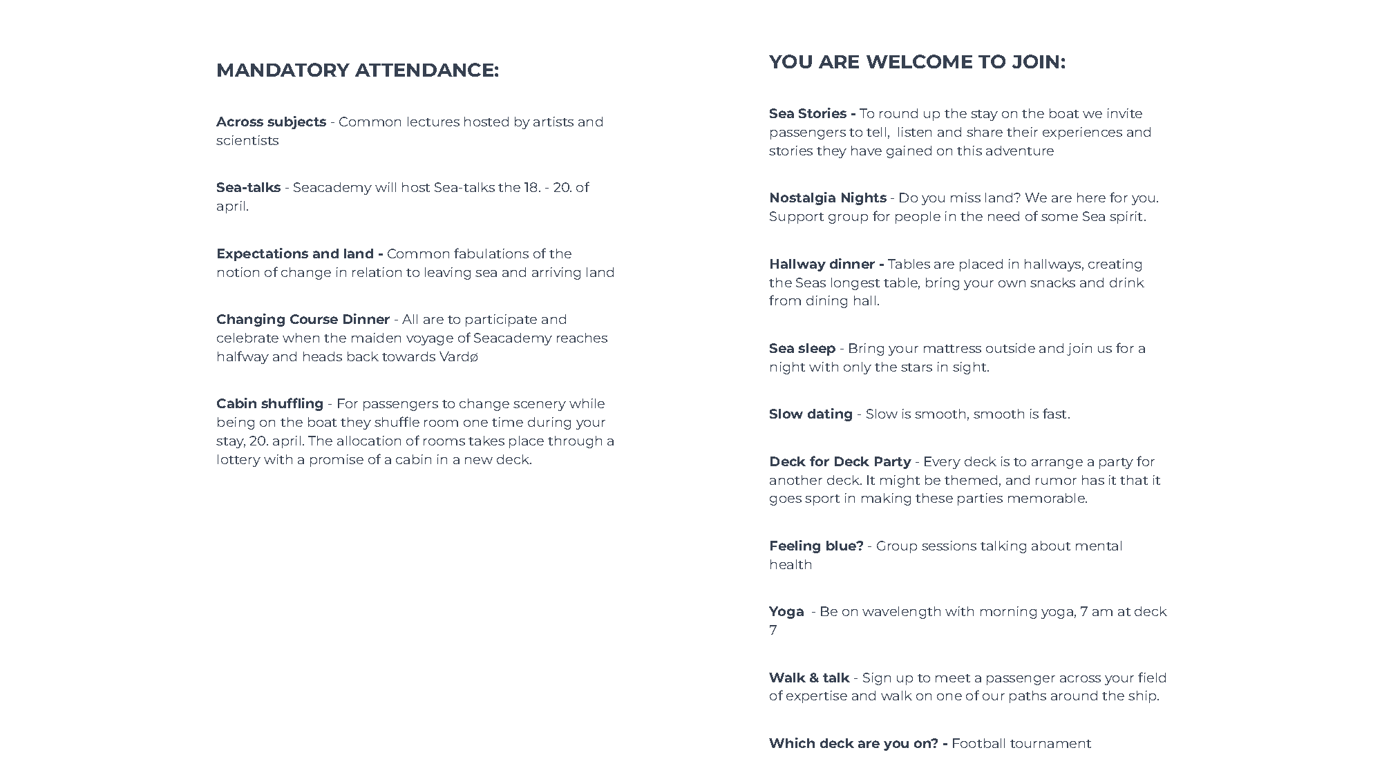 clear your mind- there is no dust at sea • nothing is barren about the Barents • get closer to the milky seas, blooming plankton, stars and moonlight without match on land• contribute amongst peers and receive tenfold back • live, breathe and study with the sea • exist in anohtr way √ jump in for the adventure of a lifetime • push the boundaries on international waters • you ex is definitely not on this ship •feel free • join the seacademy • an academic odyssey.