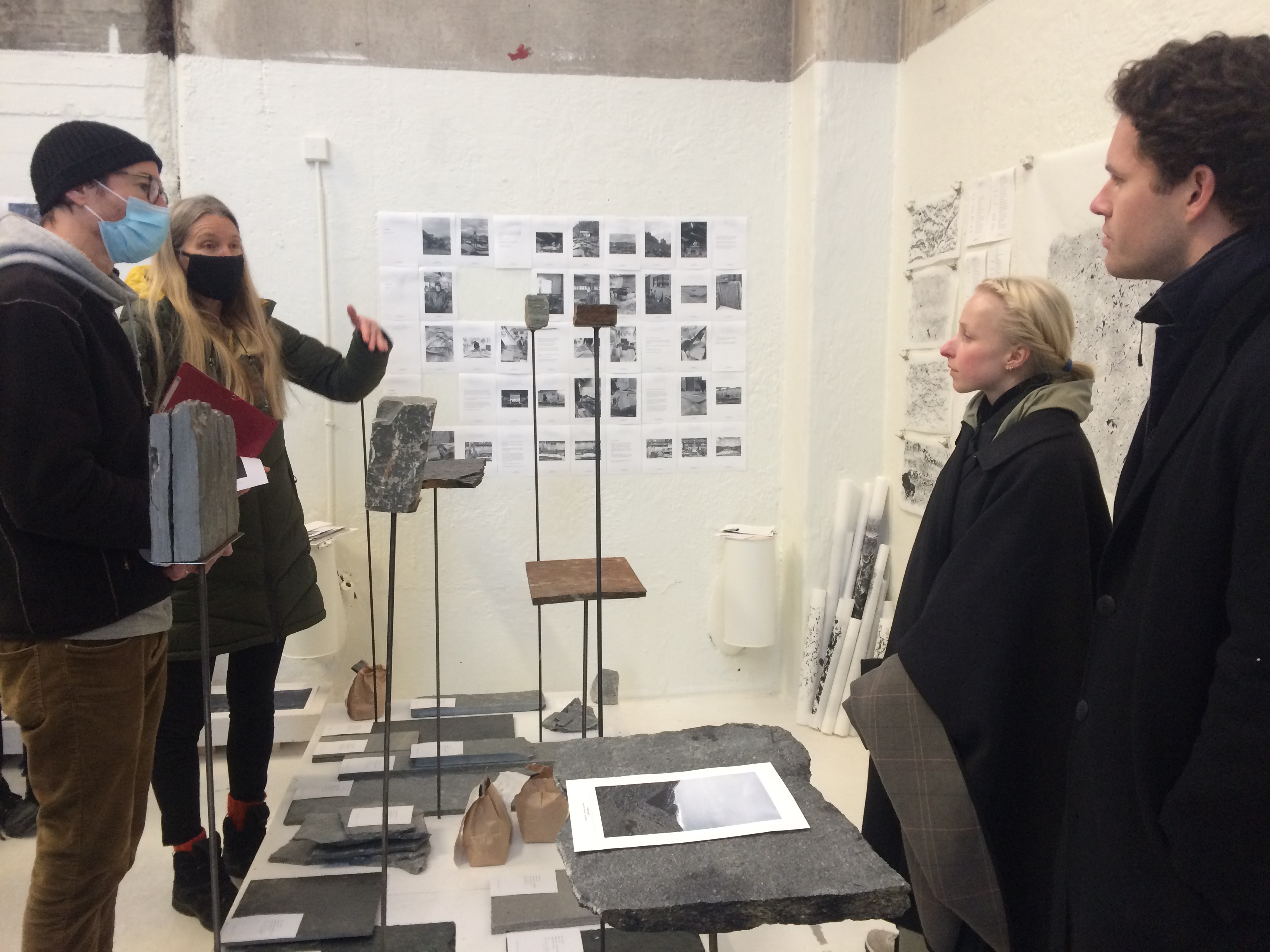 The final proposal utilizes waste slate fragments to produce “Naturbetong”, inspired by Erling Visjø and his work in the Oslo Government Quarter, including test samples made by the authors.