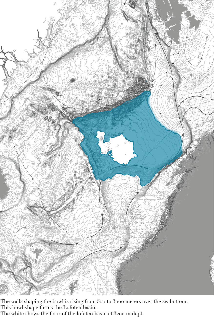 The bathymetry shows that a bowl formation– the Lofoten basin– under the Lofoten Vortex is stopping the vortex from moving.