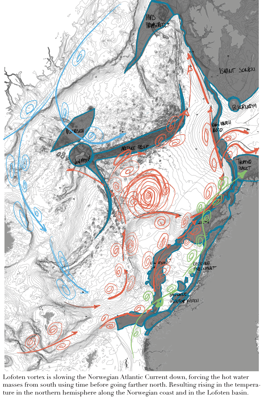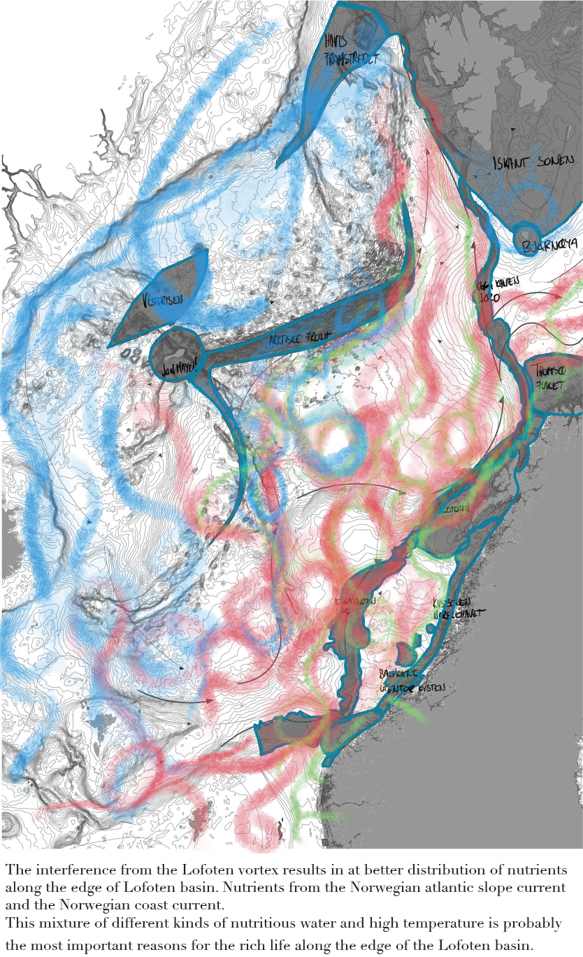 The interference from the Lofoten vortex results in a better distribution of nutrients along the edge of the Lofoten basin. Nutrients from the Norwegian atlantic slope current and the Norwegian coast current.